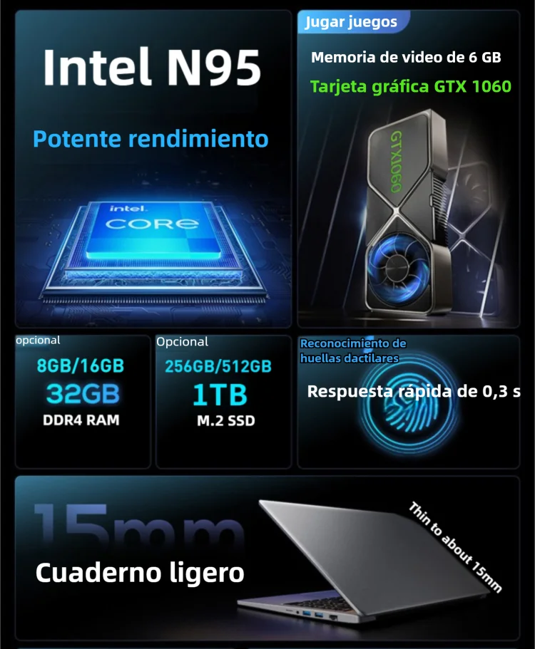 ↑Laptops para juegos de 15,6 ", ordenador portátil, intel N95 GTX1060, 16GB DDR4, 1TB SSD, Windows 11, teclado retroiluminado para jugadores - TopDealBoxFirebat-ordenador portátil A16 de 16 pulgadas, CPU N5095, N100, 16GB de RAM, SSD, 512GB, 1TB, BT4.2, WiFi5, LPDDR4, Notebook de negocios ligero Laptops para juegos intel N5095 de 15,6 ", ordenador portátil, 8GB, 16GB, DDR4, 512G, 1TB SSD, Windows11, IPS, ofertas de teclado retroiluminado Laptops para juegos intel N5095 de 15,6 ", ordenador portátil, 16GB, 32GB, DDR4, 512GB, 1TB SSD, Windows11, IPS, ofertas de teclado retroiluminado Laptops para juegos intel N5095 de 15,6 ", ordenador portátil, 16GB, 32GB, DDR4, 512G/1TB, SSD, IPS, Windows11, ofertas de teclado retroiluminado